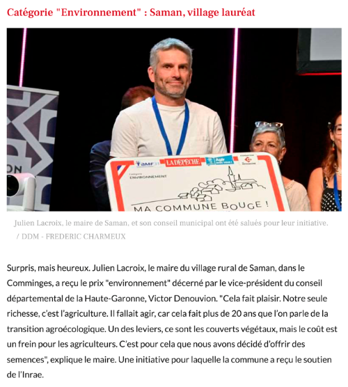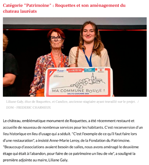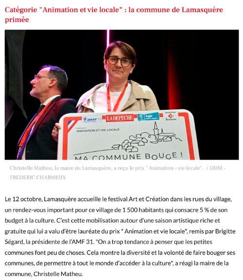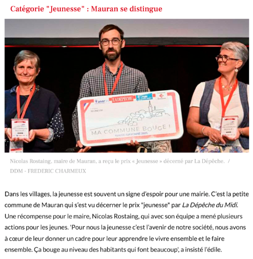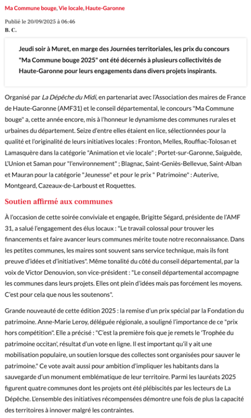 - Organisé par La Dépêche du Midi, en partenariat avec l'Association des maires de France de Haute-Garonne (AMF31) et le conseil départemental, les prix du concours "Ma commune bouge 2025" ont été décernés à plusieurs collectivités de Haute-Garonne pour leurs engagements dans divers projets inspirants.